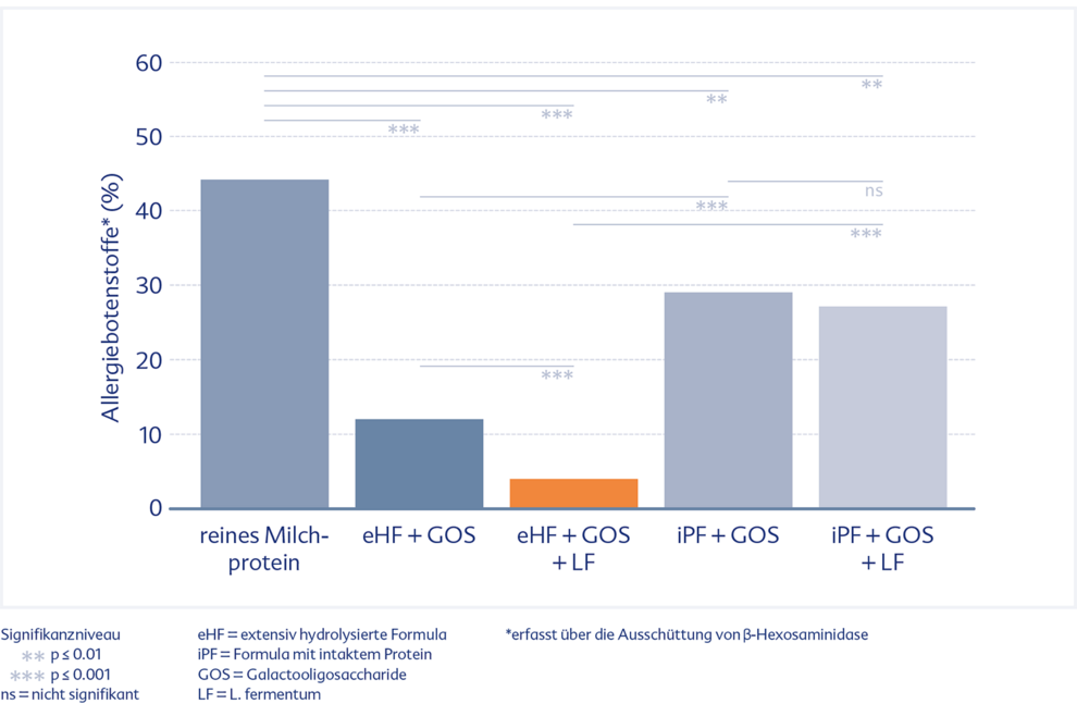 Ziel der in-vitro-Studie war es, eine extensiv hydrolysierte Säuglingsnahrung (eHF) auf Molkenbasis, angereichert mit Galaktooligosacchariden (GOS) und Limosilactobacillus fermentum CECT5716 (LF), auf deren Eignung zur Prävention von KMA zu untersuchen. Hierfür wurde das allergene Potenzial der Säuglingsnahrung sowie deren Effekte auf die T-Zell-Proliferation und die Zytokinausschüttung untersucht.