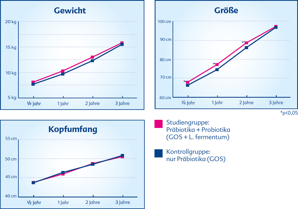 Die Daten von 91 Kindern, die ursprünglich an der Anfangsnahrungsstudie von 2012 teilgenommen hatten, konnten für das randomisierte Follow-up verwendet werden. Primäres Ziel war das Wachstum anhand von Gewicht, Länge und Kopfumfang im Alter von 0,5, 1, 2 und 3 Jahren zu erfassen. Maldonado et al. zeigten, dass die Kinder, die im ersten Lebenshalbjahr eine Säuglingsnahrung mit GOS und L. fermentum bekommen hatten (Interventionsgruppe), im Alter von drei Jahren adäquat gewachsen sind, im Vergleich zu Säuglingen, die eine Nahrung ohne Probiotika (Kontrollgruppe) erhalten hatten.