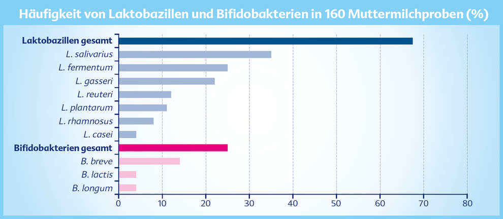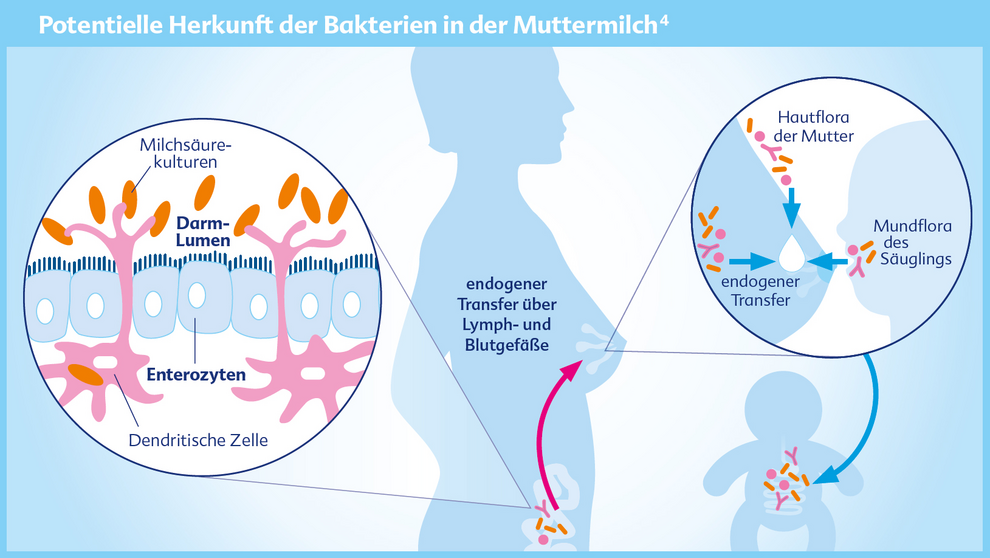 Die Besiedlung des Darms mit Bakterien (Mikrobiota) beginnt vermutlich schon vor der Geburt und unterstützt das noch unreife, kindlichen Immunsystems des Säuglings. Seit einigen Jahren ist bekannt, dass die Muttermilch eine wichtige Quelle von kommensalen Bakterien für den Säugling darstellt, die den kindlichen Darm besiedeln. Die Anzahl der Bakterienspezies in humaner Milch ist mit vermutlich mehreren hundert Arten sehr komplex. Als besonders bedeutsam für den Säugling werden die Gattungen Lactobacilli und Bifidobacteria angesehen. Laktobazillen haben eine Art „Pionierfunktion“, da sie zu den Erstbesiedlern zählen und für nachfolgende Keime ein günstiges Milieu schaffen.