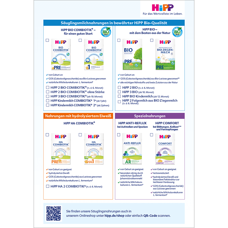 Empfehlungsblatt für die Wahl der richtigen Säuglingsnahrung: Auf dem Abreißblock kann die entsprechende Säuglingsnahrung angekreuzt werden und blattweise an die Eltern herausgegeben werden.