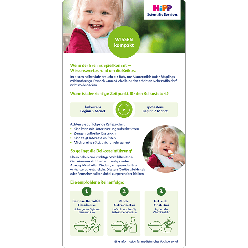 Der empfohlene Zeitraum für die Einführung von Beikost berücksichtigt den steigenden Nährstoffbedarf der Säuglinge, individuelle Unterschiede in der motorischen Entwicklung sowie Aspekte der sensorischen Akzeptanz und Allergieprävention. Auch nach Beginn der Beikosteinführung sollte weiterhin gestillt werden.1