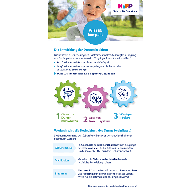 Die bakterielle Besiedelung des Gastrointestinaltraktes trägt zur Prägung und Reifung des Immunsystems im Säuglingsalter entscheidend bei. Neben kurzfristigen Auswirkungen wie der Häufigkeit von Infektionen, wirkt sich die Entwicklung der Darmmikrobiota auch langfristig auf die Entstehung von z. B. allergischen, metabolischen oder entzündlichen Erkrankungen aus.1 So stellt eine gesunde Darmmikrobiota die Weichen fürs ganze Leben.