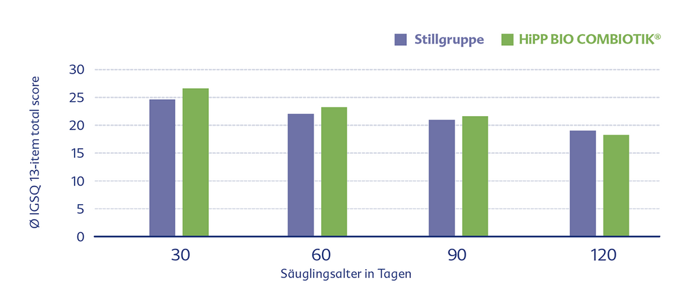 Eine andere Studie betrachtete die Verträglichkeit anhand eines standardisierten Fragebogens (IGSQ). Auch hier zeigte die HiPP BIO COMBIOTIK® eine sehr gute Verträglichkeit ähnlich wie bei gestillten Säuglingen.5