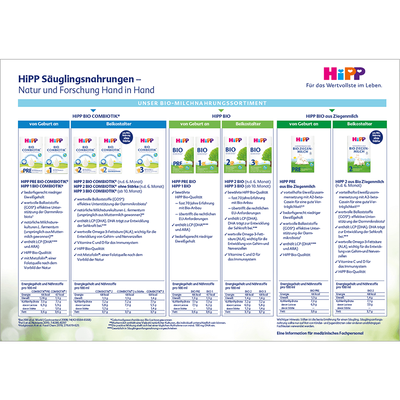 Hinweis: HiPP Milchnahrungen aus Bio-Ziegenmilch enthalten dennoch kuhmilchähnliche Proteine und dürfen daher nicht verwendet werden, wenn bereits eine Kuhmilcheiweißallergie oder der Verdacht auf eine solche besteht.