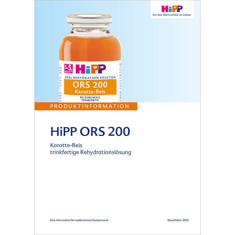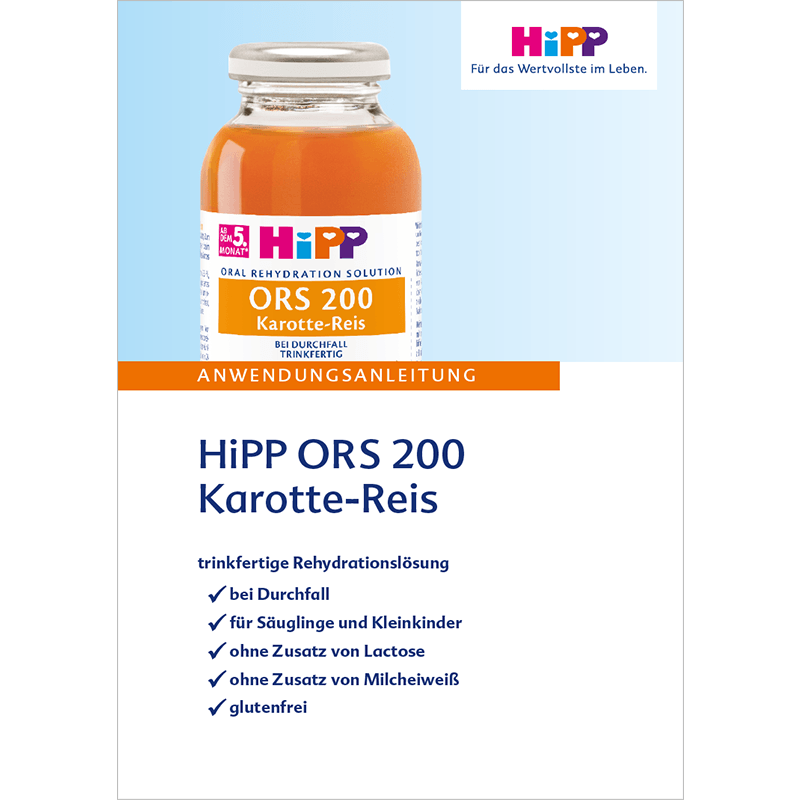 Zusätzlich zur gewohnten Nahrung werden die noch laufenden Verluste durch wässrigen Stuhl und/oder Erbrechen durch HiPP ORS 200 ersetzt: z. B. 10 ml/kg KG bei jedem wässrigen Stuhl/Erbrechensepisode.